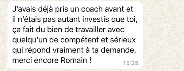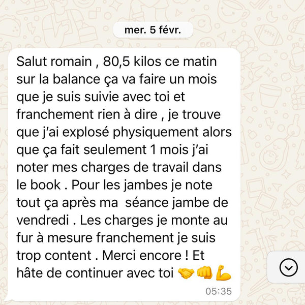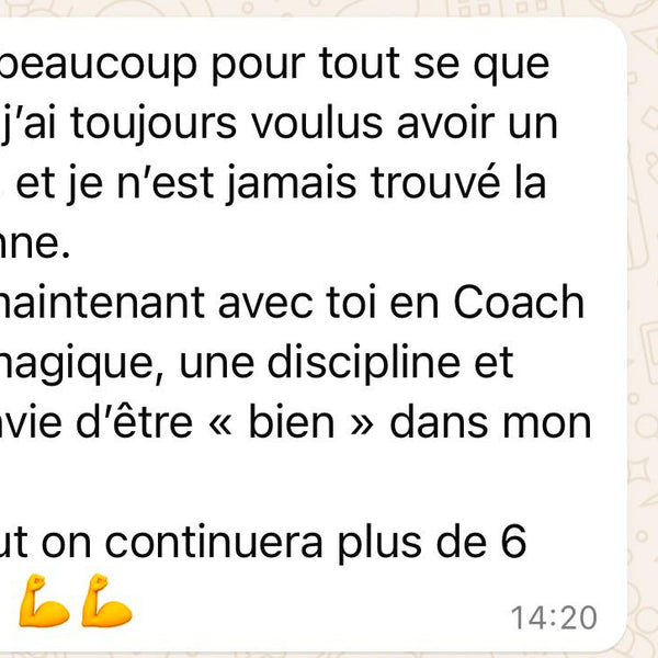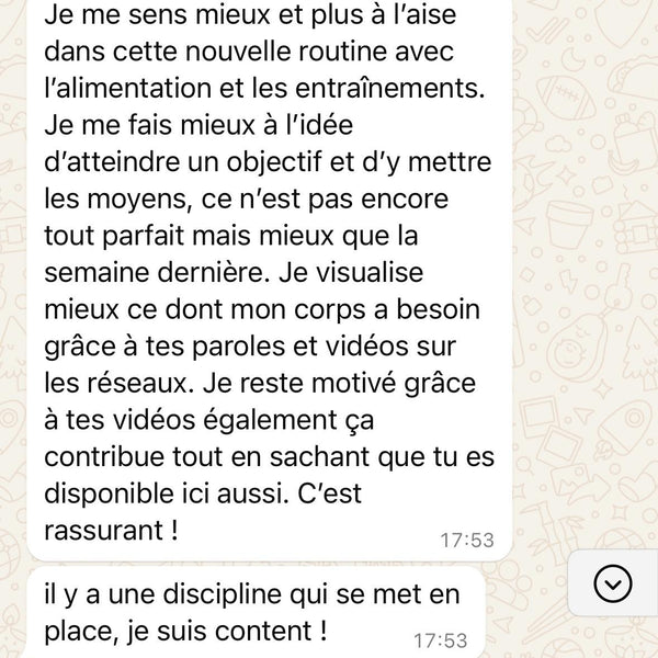 Je serais disponible sur Whatsapp 7j / 7 pour répondre à toutes tes questions concernant le programme et ton évolution.